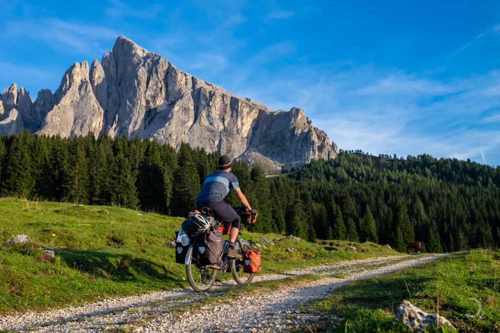 Auf der traumhaften Seiser Alm wache ich mit Rückenschmerzen auf. Sonne scheint, also rauf aufs Bike – wird schon. Doch nach einer Nacht im Wald auf der Bank und drei Pässen der Sella Ronda später geht nix mehr. Statt Bikepacking-Abenteuer nur noch Kriechen auf allen Vieren – Dolomiten extrem.